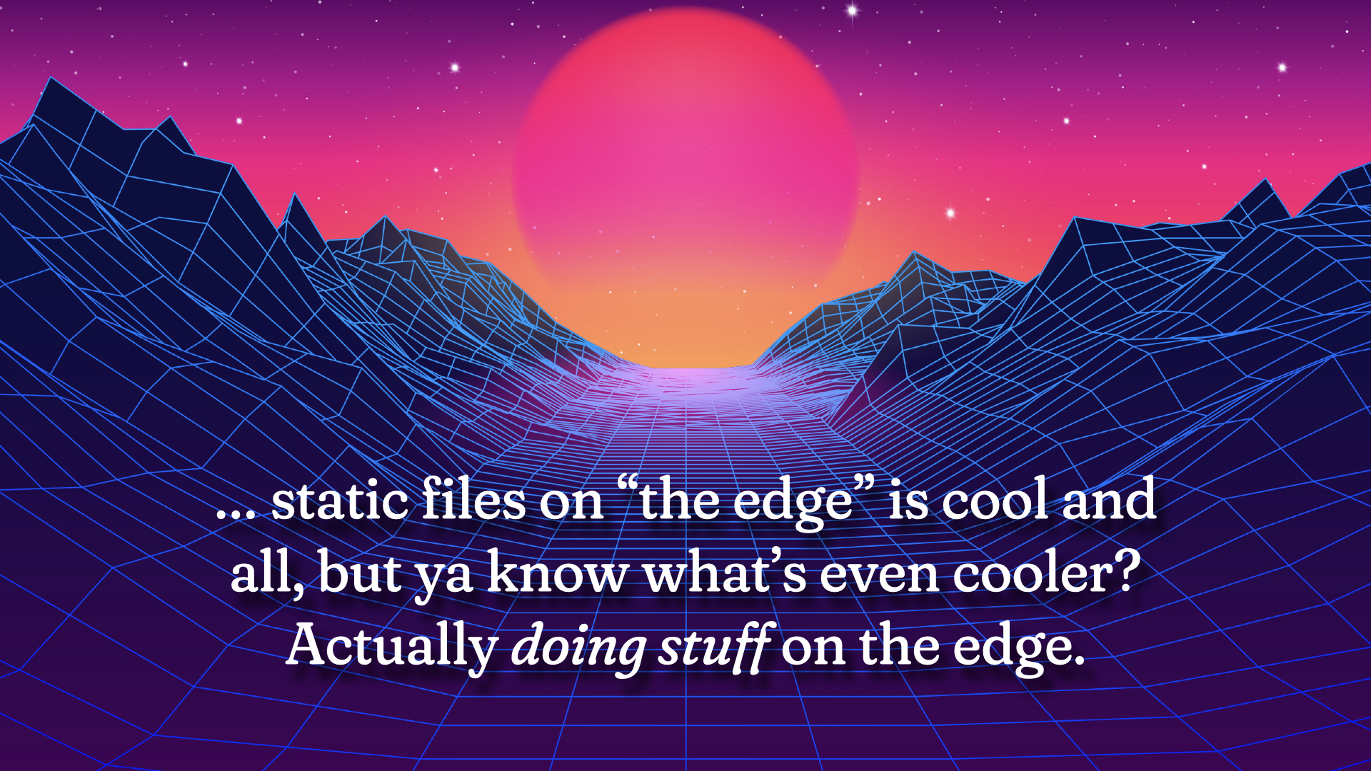 But speaking of Cloudflare, I also like using their Cloudflare Workers product, because it’s capable of running JavaScript at edge nodes also. You gotta use them anyway to get your hands on that K/V data. But say you don’t actually wanna keep your data in K/V, you just need to keep it on your sad little Amsterdam single-origin server. You can still use the Cloudflare Worker to do the fetch to that single-origin server for you. I’m going to repeat that: you can still use the Cloudflare Worker to do the fetch to that single-origin server for you.