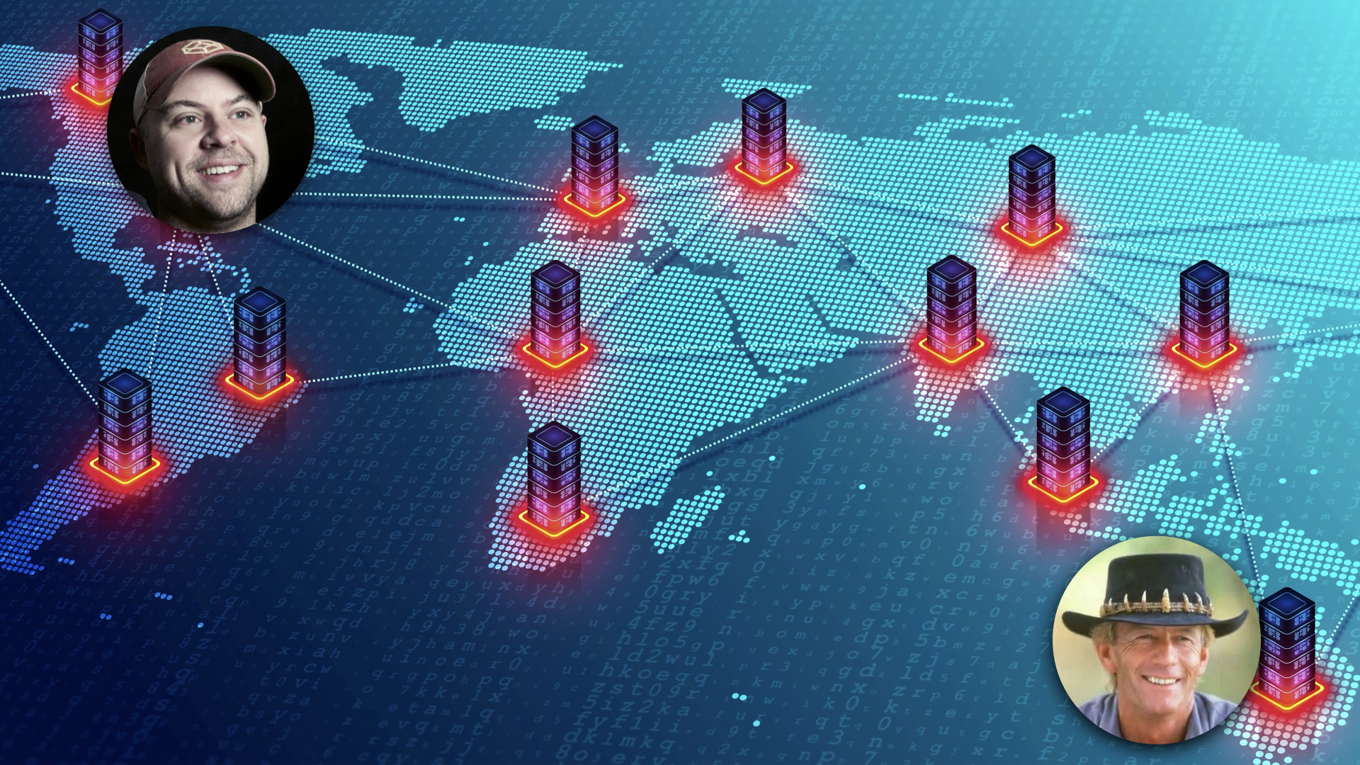 So lemme make the point again with my slides. Here’s me in… the Yukon Territory apparently. And there’s Paul Hogan down under. Here is a super cliche stock photography example of a CDN. Look! There are servers all around the world that are geographically close to large populations! Thanks, Shutterstock.