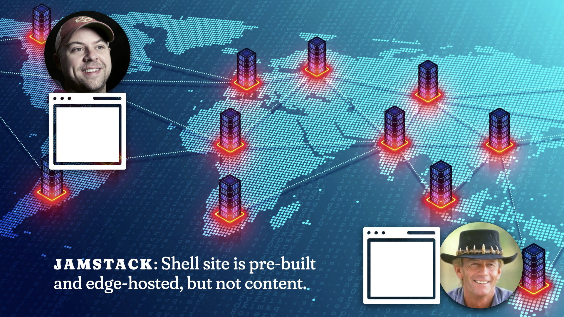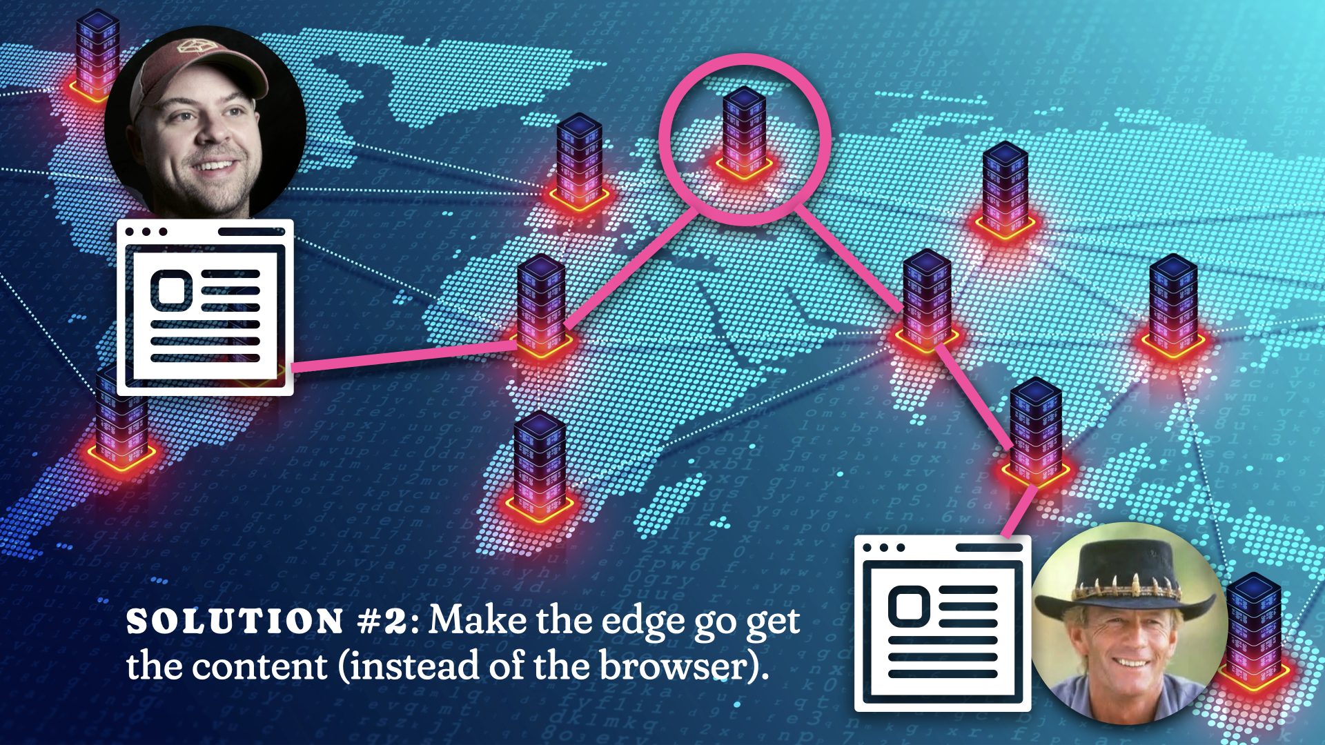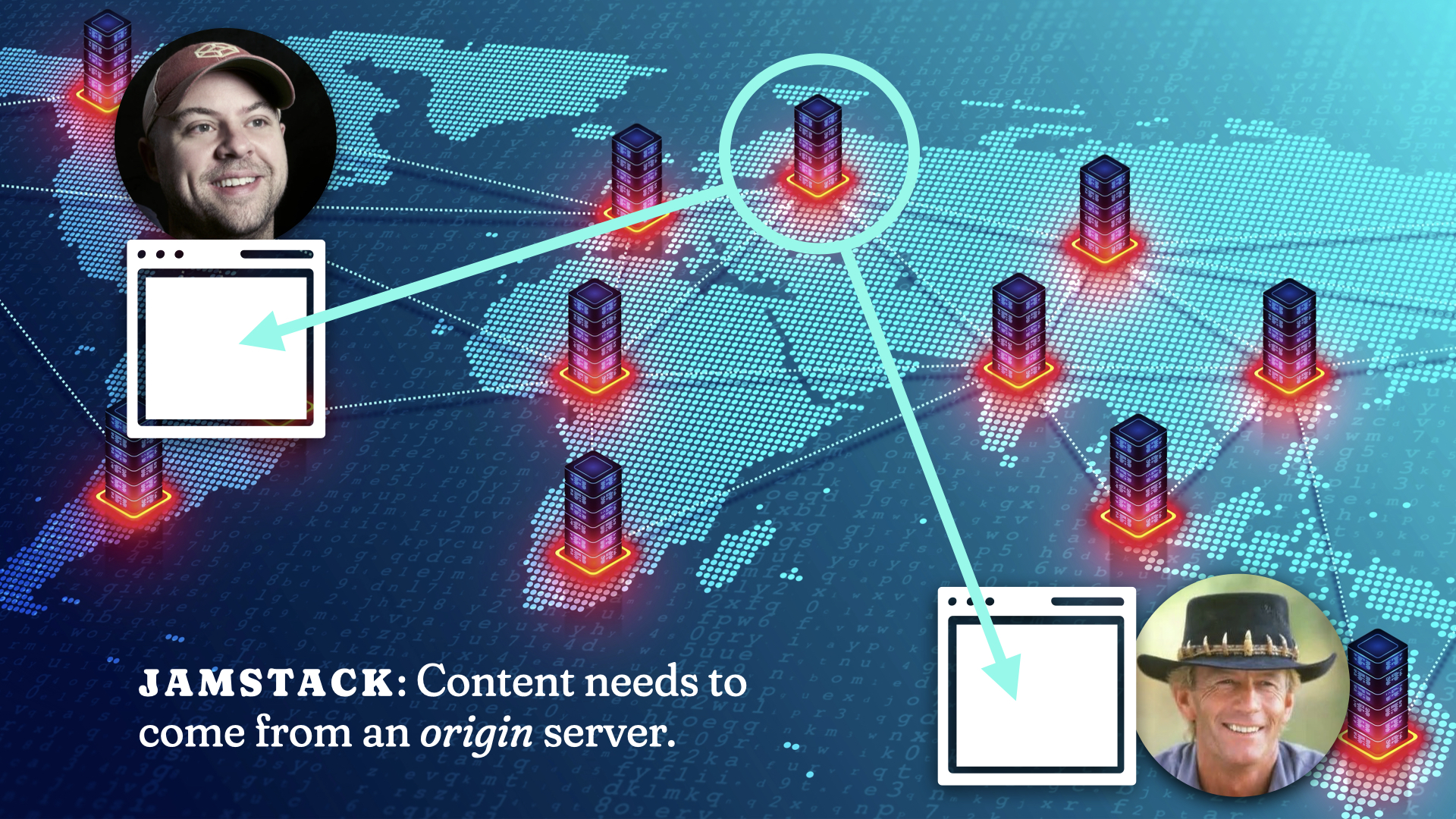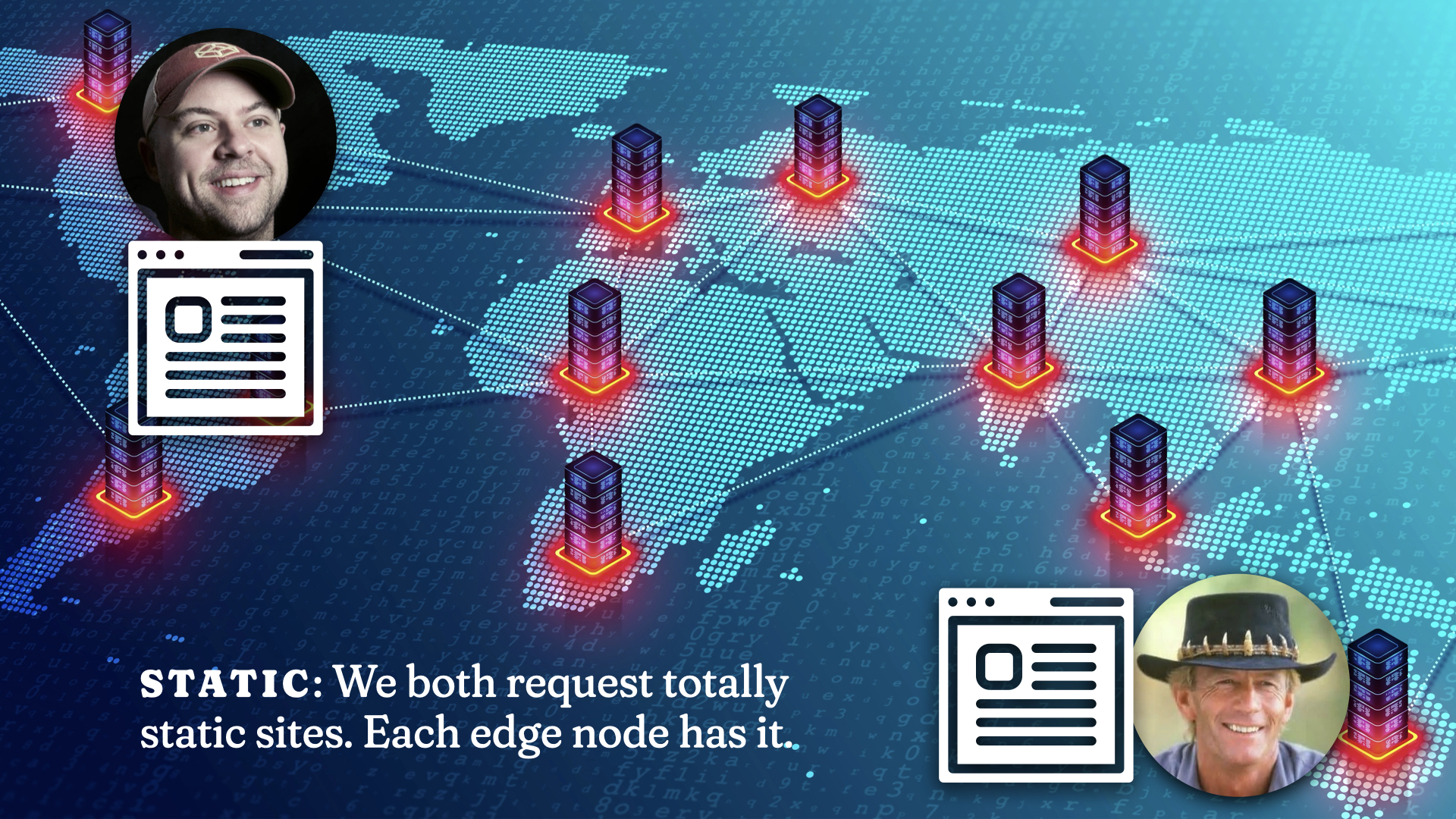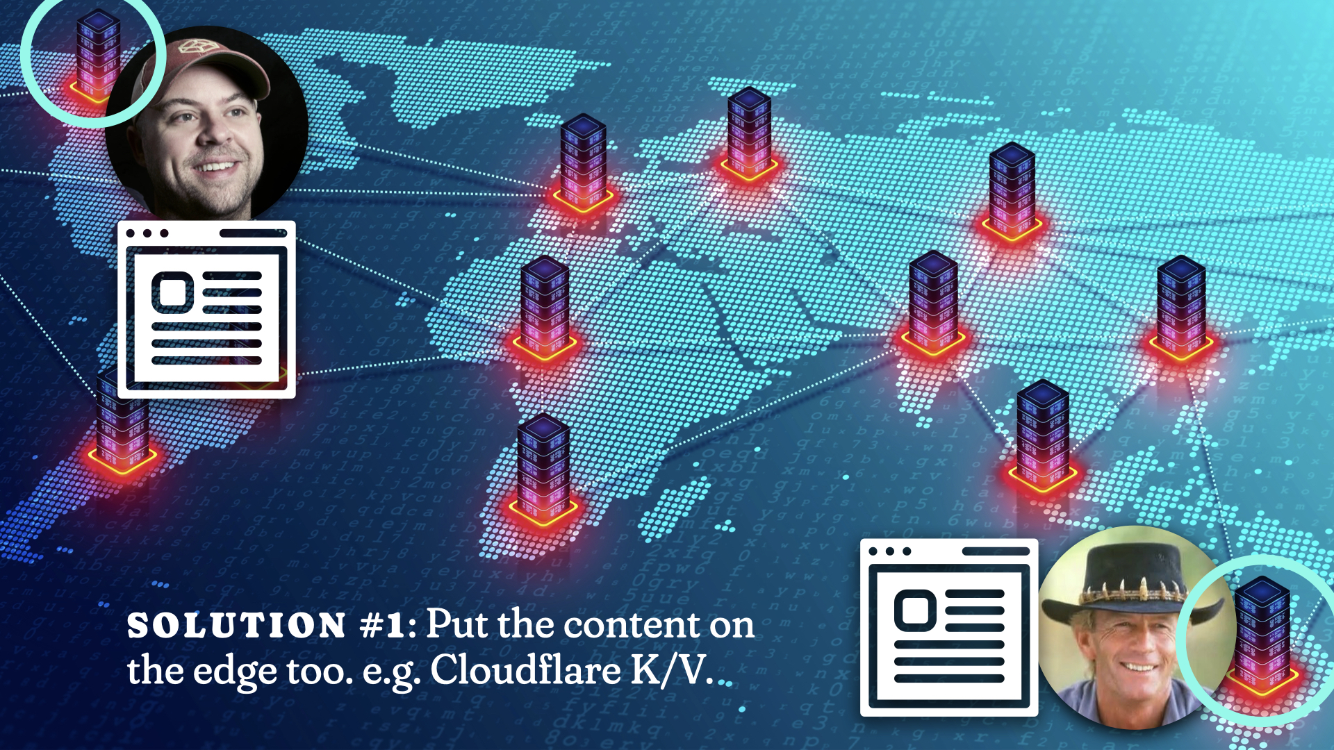 How do we get that content to edge nodes? I don’t know really. That’s where you come in. Invent stuff, please. Or tell me about things that already exist. I do know about one thing that exists: Cloudflare K/V. K/V means Key/Value, so it’s not like a full-on relational database or whatever, but I imagine you can make a K/V store do a lot of work if you had to. The magic of it is that K/V data is somehow instantly replicated on every Cloudflare edge node. So the data is actually geographically close to Paul Hogan and other Austrailians.